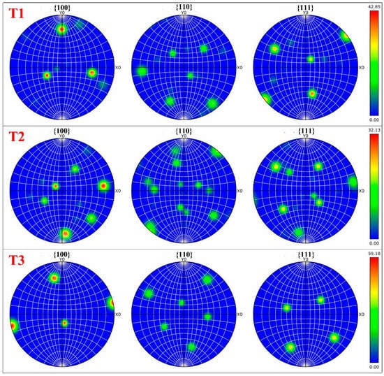 Figure 3 presents the sample textures. It shows that the samples represent a stronger texture in the {100} orientation than that of {110} and {111} orientations. The maximum texture intensities of T1, T2, and T3 samples observed in the {100} orientation are 42.85, 32.13, and 59.18, respectively, indicating that T3 has the most concentrated texture. This is because the change in printing parameters leads to different cooling rates and grain growth mechanisms, resulting in different grain orientations and texture intensities [30].