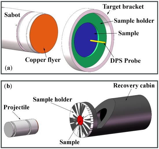 Experimental configurations for (a) free-surface particle velocity measurements and (b) shock-recovery characterizations. A Cu flyer is launched by a single-stage gas gun to produce spall damage in TC4 samples. DPS is used to monitor the free-surface velocity profile. A recovery cabin is used to capture the target sample for shock-recovery characterizations.
