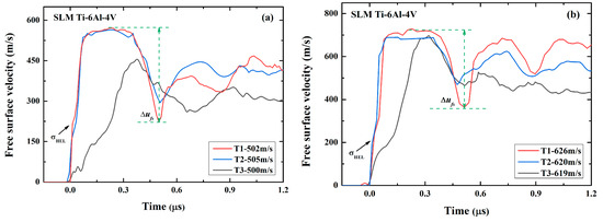 Free-surface particle velocity profiles of three SLM TC4 samples obtained in planar plate experiments at the impact velocity of (a) 500 m/s and (b) 620 m/s.