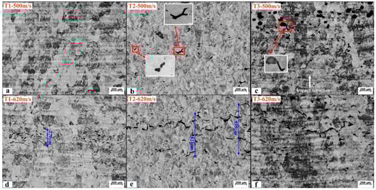 To further understand the dynamic behaviors of shocked materials, shock-recovered samples were characterized by using OM, as shown in Figure 7. At the impact velocity of 500 m/s, no cracks are visible in sample T1, while in the samples T2 and T3 there exist obvious isolated cracks. Some cracks have rounded tips, suggesting the coalescence of voids [34,35]. Such an observation is somehow inconsistent with the observed velocity profiles in which the spallation occurs in the samples T1 and T2. We attribute this inconsistency to the incomplete spallation in sample T1 because it has a higher resistance to dynamic tension than the samples T2 and T3 as indexed by the spall strength. In the sample T3 recovered, the collapse of voids is clearly observed, providing direct evidence for the shock-driven compaction. At the impact velocity of 620 m/s, complete spallation takes place in all three samples, thus obvious spallation damages are visible. In the sample T1, a large number of small cracks with a length of less than 50 µm locate at the zone with a width of 270 μm. While in the samples T2 and T3, the damage region expands significantly, suggesting that cracks originate from widely distributed voids.