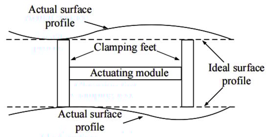As shown in Figure 1, the morphology of the actual working surface of the guide mechanism has changed slightly, which makes the clamping mechanism not only unable to achieve a differential clamping state in actual work, but also has a significant impact on the clamping force. Therefore, it is difficult to produce alternating clamping in two groups of clamping mechanisms with a certain span by using the micron deformation of laminated piezoelectric ceramics. On the one hand, the guide mechanism needs to have a high degree of parallelism; on the other hand, the overall dimension of the clamping mechanism needs to be highly consistent.