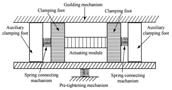 To reduce the adverse effects caused by micromorphology deviation, a new inchworm motor with springs servo differential clamping mechanism is proposed in this paper. Its schematic diagram is shown in Figure 2. The actuator is composed of four groups of clamping mechanisms, a group of actuating modules, and a guiding mechanism. The clamping mechanisms are in two groups and are combined in an elastic connection. One clamping mechanism in each group is fixedly connected with both ends of the actuating module along the actuating direction. Here, the clamping mechanism directly and fixedly connected with the actuating module is called the clamping foot, while the clamping mechanism elastically connected with the main clamping is called the auxiliary clamping foot.
