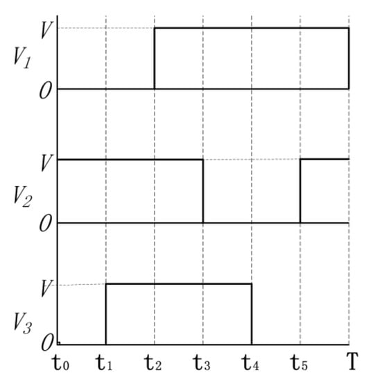 Three voltage signals with different phases are connected to piezoelectric parts (11, 12, 3, 21, and 22 shown in Figure 3) to excite the needed deformation of each piezoelectric part. These three voltage signals are shown in Figure 4.
