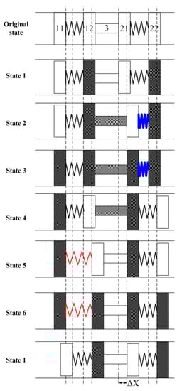 According to Figure 3 and Figure 4, the states of piezoelectric parts during one period are shown in Figure 5. The deformation phase of elements 11 and 12, and 21 and 22 are designed to be reversed, which assures the clamping state of 12 and 21.