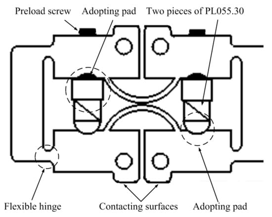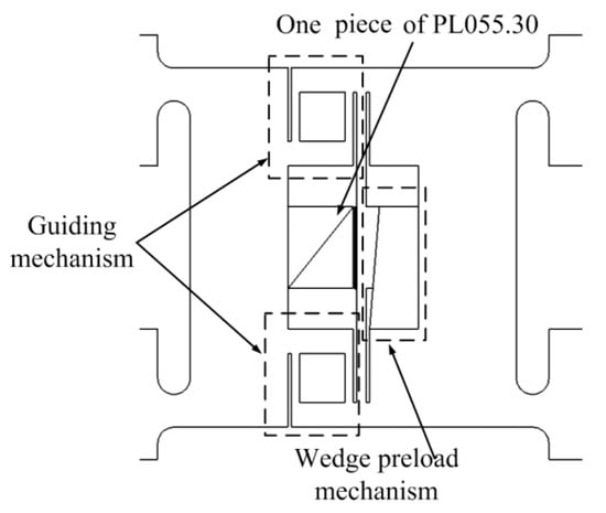In Figure 7 and Figure 8, details of the pushing element and clamping element are shown. The flexible hinges act as the pivot point of the lever mechanism and they also provide preload for multilayer piezoelectric ceramics. Surfaces for supporting multilayer piezoelectric ceramics must be strictly parallel and adjustable supporting pads are used to ensure multilayer piezoelectric ceramics suffer even pressure. Moreover, the contacting surfaces of major clamping elements and auxiliary clamping elements are close to each other so that these surfaces could clamp the guiders alternatively regardless of the processing errors. The pushing element in Figure 6 uses one piece of PL055.30 and a guiding mechanism is utilized to provide preload and link two major clamping elements. The wedge mechanism is utilized to apply the needed preload.