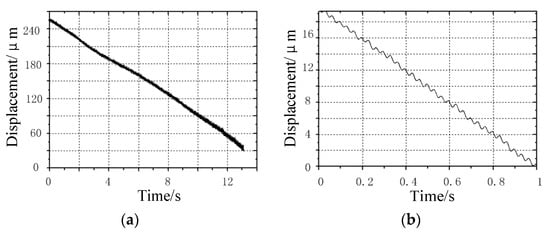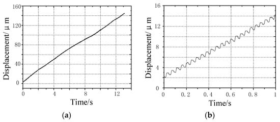 As shown in Figure 11, it is the travel curve of the prototype under the excitation frequency of 30 Hz. Figure 11a shows the travel curve of the prototype within 13 s. Due to the surface defect of the contact between the guide rail and the clamping feet, the speed of the prototype changes slightly during the travel. Figure 11a shows that the travel curve is not straight, and the prototype travels for 250 μm within 13 s. The average speed is 19 μm/s; Figure 11b shows the walking curve of the prototype within 1 s. It can be seen that the prototype has advanced 30 steps within 1 s, and the distance is about 19 μm. Therefore, the step distance of the prototype is about 0.63 μm. It can be seen from the curve of each step that there is a certain reciprocating oscillation in each step of the prototype, which may be caused by the overshoot of the square wave signal when charging the capacitive load laminated piezoelectric ceramics.