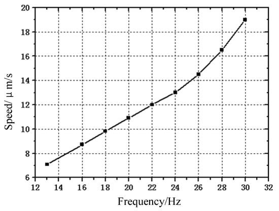 During the no-load operation of the prototype, the characteristics of the excitation signal was kept unchanged, except the excitation frequency. The relationship curve between the output speed and the excitation frequency is shown in Figure 13. It can be seen that when the excitation frequency of the prototype is lower than 24 Hz, its operation speed increases linearly with the excitation frequency. When the excitation frequency is further increased, its operation speed increases faster. This is because when the operating frequency of the prototype increases, the running speed of the prototype increases, and the sliding between the clamping feet and the guide rail increases, so that the speed increase becomes larger.