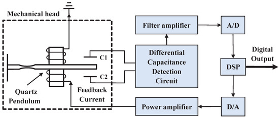 The micro quartz flexible accelerometer, mainly composed of a mechanical meter and servo circuit, is a kind of closed-loop mechanical pendulum accelerometer. Essentially, it is a mass-spring-damping system. Compared with a traditional analog quartz flexible accelerometer, the digital one appends the AD conversion module, digital signal processor, and DA drive module so as to form a complete digital closed-loop system. The structure of the digital quartz flexible accelerometer is shown in Figure 1.
