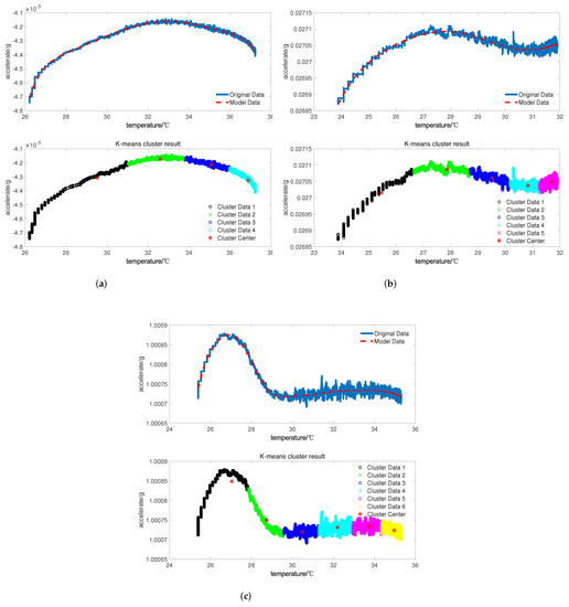 There is strong nonlinear adaptability for the Fourier transform itself, and the higher the order, the stronger the nonlinear fitting ability. Hence, theoretically, the model can better fit the complex temperature characteristics for the accelerometer’s cold start-up phase. The emphasis is on the calculation of the order of the Fourier transform and other model parameters. Therefore, to improve the efficiency of the compensation, research into clustering algorithms for data feature extraction and intelligent optimization algorithms to optimize model parameters has been undertaken.