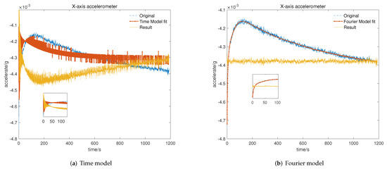 Result of temperature compensation for X-axis accelerometer: (a) compensation with time-related model; (b) compensation with Fourier-related model.