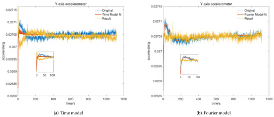 Result of temperature compensation for Y-axis accelerometer: (a) compensation with time-related model; (b) compensation with Fourier-related model.