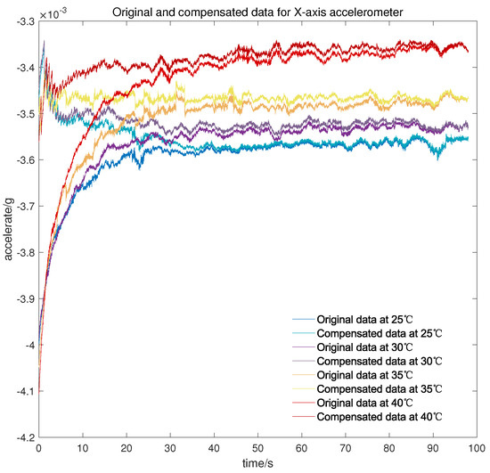 Original and compensated data for X-axis accelerometer at different temperature points.