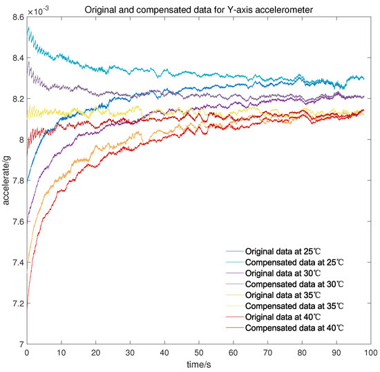 Original and compensated data for Y-axis accelerometer at different temperature points.