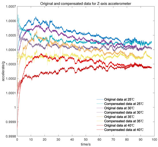 Meanwhile, to verify the applicability of the model in the cold start-up phase at different temperature points, another micro three-axis accelerometer is adopted to conduct the cold start-up tests for about 100 s at 25 °C, 30 °C, 35 °C, and 40 °C, respectively. As can be seen from Figure 10, Figure 11 and Figure 12, there is still a small amount of residual drift after the compensation, which is attributed to slight differences in the output characteristic in the cold start-up phase at different temperature points. Furthermore, the short-term output of the accelerometer after compensation is serrated because the proposed temperature compensation model is continuous in the temperature domain and the output changes greatly within the same measured temperature. There are two methods for the stability statistics of the accelerometer. One is on the basis of the output data over a continuous period of time, and the other is to count the mean value of the output data at different temperature points. The proposed model is mainly used to improve the stability under the first statistic, but it is also worth listing the mean value before and after compensation.
