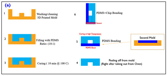 Today, many papers have reported the integration of microfluidics with electronic sensors. Sensor-integrated microfluidic devices were reported for applications such as DNA hybridization [28,29], polymerase chain reaction (PCR) on-chip [30,31], virus detection [32,33], cancer detection [34,35], circulating tumor cells (CTC) analysis [36,37], exosomes analysis [38,39], nucleic acids analysis [40,41], liquid biopsy-based assays for cancer detection [42]. CMOS-based sensors integration with microfluidic is put forward for cell analysis [43,44], chemical sensing [45], optical biosensing [46], ultraprecise micro pumping [47], 2D nanomaterial detection [48], optofluidics biomedical devices [49]. For CMOS sensors integration with microfluidic, the direct-write microfluidic fabrication process (DWFP) was introduced as a comparatively new rapid technique for creating microfluidics atop an electronic chip [50]. The same DWFP method was used for chemical sensing [51]. More advanced techniques were implemented to integrate continuous microfluidic with capacitive CMOS sensor real-time cell analysis [45].