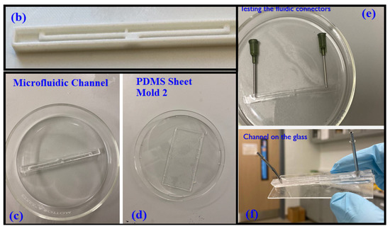 The PDMS chip was then placed inside the oven and baked for 5 min at 100 °C. This condition yields a flexible PDMS structure; therefore, it is in excellent condition to easily be peeled off from the thin mold. Other temperatures with a longer time (at lower temperatures) result in a solid PDMS, making it hard to remove, and in most cases, it breaks near the inlet or outlet. At the same time, these processes were tried for another mold, which created a thin layer of PDMS (1 mm) to cover the channel (see Figure 5d). After placing the channel on the PDMS sheet with UV curable glue, the bonding was strengthened by applying UV light on both sides with a hand-held UV lamp (UV 365 nm light) for 5 min. This helped to make a strong bonding for the PDMS–PDMS connection. The mold that includes the channel geometry was placed on a uniform large PDMS sheet; therefore, the issue of the cumbersome bonding process of PDMS–PDMS was avoided. Subsequently, the whole microfluidic channel was cut out under the microscope to release the structure shown in Figure 5f. After removing the structure, it was again heated and immediately put on the chip.