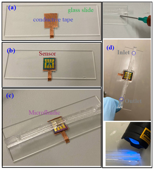 Bonding process of the microfluidic channel on the chip. (a): A copper conductive tape was utilized to create the back-gate connection on the glass slide. (b): the sensor was put on the sensor. (c): after heating the microfluidic, it was aligned with the chip under a microscope. (d) filling the gap underneath the microfluidic with UV curable glue and applying UV light to make the structure strongly bonded.