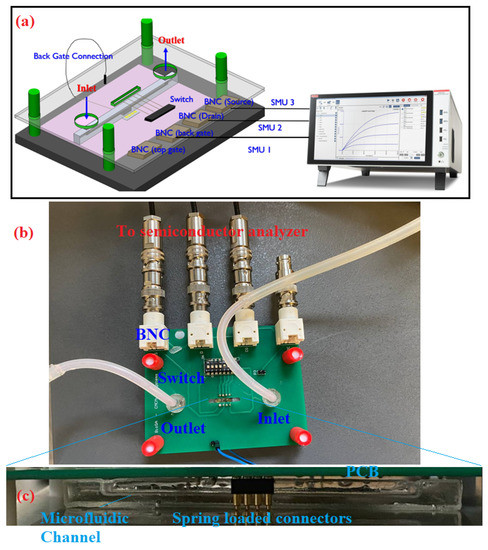 The sensor was characterized in reverse bias mode by applying a positive voltage to the back gate (see Figure 1) through a semiconductor analyzer (Keithley 4200A-SCS Parameter Analyzer, Tektronix, Beaverton, OR, USA) by a stepwise voltage increment from 0 to 1 V with 0.1 steps. At the same time, the drain–source voltage was swept from 0 to 5 V with 0.2 V increment. The p-n junction was maintained turned off in this mode, ensuring zero current from the back gate into the p-type channel. A general view of the integrated sensor and microfluidic with the fixture is shown in Figure 7. The inlet tube was connected to a syringe, and the solution was loaded. The fluid was maintained stationary inside the channel to ensure the possible noises due to turbulence in the ions flow near the surface. The setup was used for making contact with the sensor pads; therefore, the device could be used without the need for huge probe station. The switch on the PCB made the OG-JFET channel selection much easier. Therefore, when the fluid was in contact with the sensor, the channels could be switched on and off to measure the fluid effects in that area.