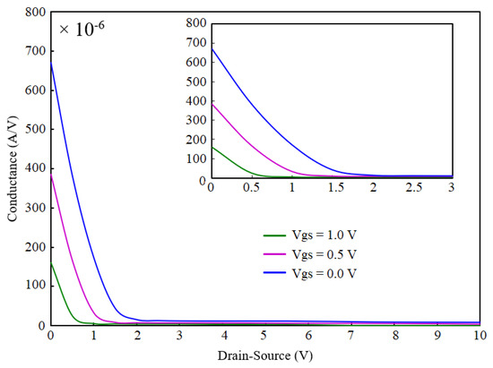 Figure 9 demonstrates the conductance of OG-JFET for different drain–source voltages when gate source is applied on the sensor. This curve clearly shows the effect of back gate on the control of the channel conductance. According to Figure 9, the conductance decreases when drain–source voltage is applied, narrowing the channel due to back-gate space charge modulation. The channel conductance approaches zero at higher back-gate voltages (=1 V).