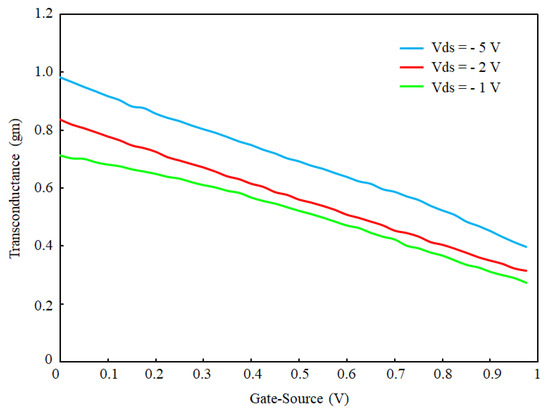 The transconductance (gm) of the sensor is calculated based on the experimental results (see Figure 10). The gm is depicted vs. back gate that shows the controllability of gain with the back gate. Additionally, the result demonstrates that the gm linearly decreases with increasing the back gate. The gain is calculated by taking the first derivative of the Ids–Vgs curve shown in Figure 8b. The maximum gain of the sensor occurs at the Vgs = 0. It is noteworthy that the Vds enhancement leads to higher gains. The gain estimates the current enhancement in Equations (13) and (14), based on this result.