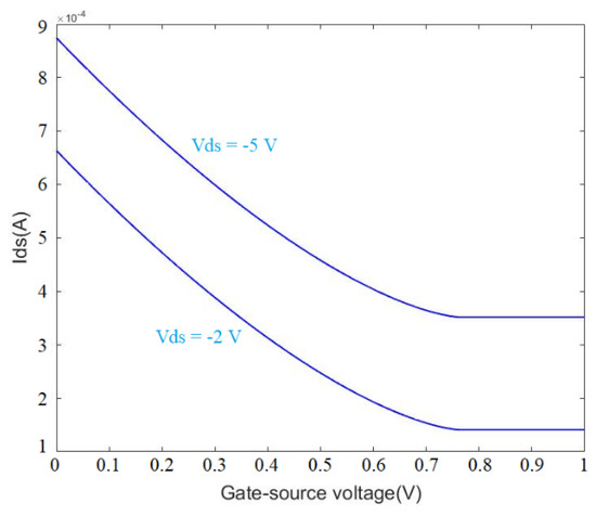 Equation (11) was solved for the gate-source voltage range of 0 to 1 for Vds values 2 V and 5 V (see Figure 13 and Figure 14). A comparison of the mathematical modeling results with the experiment indicates the model was not accurate in predicting the experiment trend for back-gate voltages higher than 0.7 V. After this voltage, the sensor response remained constant, which was not in accordance with the experiments. The mathematical modeling was discussed in previous work [74]; however, the limitations of the model were not discussed for OG-JFET with transfer characteristics being shown. Figure 13 demonstrates the point that the model was not helpful for high back-gate voltage. Therefore, the model introduced in this work and also Ref. [74] can be used for the low back-gate (preferably <0.7) and drain–source voltages (preferably <0.6). A comparison of the experimental result of sensor transfer characteristics (see Figure 8) with model result (see Figure 13) indicates that the non-idealities in fabrication processes, such as non-uniformity of doping levels, uncertainties in controlling the channel length with implantation of source and drain, might be responsible for the inconsistency between the model and the experiment.