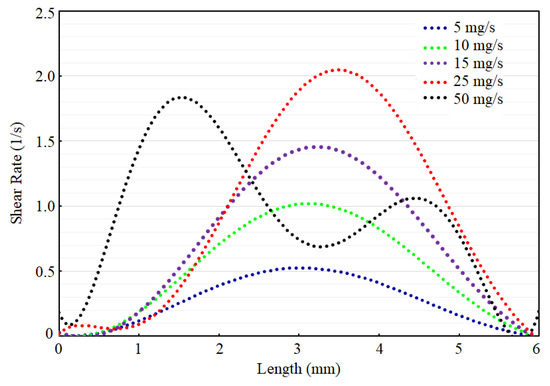 The change in shear rate for different values of inlet mass flow rate condition along the centerline of the chamber.