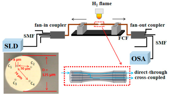 Over the past few decades, fiber optic sensing technology has been substantially improved to measure strain, pressure, temperature, humidity, vibration, and many other physical parameters with high accuracy or high resolution in harsh environments. Many different kinds of optical fibers have been invented and then played great roles in serving as the sensing devices and information transmission or lasing media. For sensing applications, the polarization, amplitude, phase, and wavelength of the lights in optical fibers can all be modulated or demodulated for delivering or analyzing sensing signals. Among fiber sensors, strain is an important parameter for industrial or scientific applications and is one kind of the essential sensors to monitor the health conditions of the system, e.g., the fatigue situations of the matrix material. Usually, fiber strain can be measured using fiber interferometers or fiber gratings [1,2,3,4,5]. When the sensing areas of the fiber interferometers or gratings are experiencing tensile or compressive stress, the resonant wavelengths will change accordingly. In order to improve the strain sensitivity of the fiber, it is very important to enlarge the optical path difference (OPD) between different modes during elongation of the fiber. To compare with those interferometric strain sensors based on SMFs, the multicore fibers (MCFs) can generally reach better results, since the excited supermodes are assumed by the different high order modes [6,7,8,9,10,11]. In recent years, multicore fibers (MCFs) have been extensively investigated for their important contributions in saving the physical space of the fiber-optic communication systems through enlarging the transmission capacity, which is also called space division multiplexing [12,13,14,15,16,17,18,19,20]. Moreover, active MCFs can also be used to achieve high power fiber lasers based on coherent beam combination [21,22,23,24,25,26]. In addition, it is known that the excited high order modes are very different from that of the traditional singlemode fiber (SMF), since the modes are significantly determined by the dimensions and configurations of all the cores. The supposed mode fields from the individual core generates interferences, which is advantageous to achieve optical sensing with multi-parameters or split optical trapping force [27]. In fusion splicing, in order to match the core positions between the SMF and MCF for delivering optical power with negligible losses, the 7-core MCFs, with one core sitting at the center position, are more popular than other kinds of MCFs to be used to make various kinds of fiber sensors [28,29,30]. However, as a result, the excited supermodes will thus be intrinsically concentric in their fields, and the strain sensors so made are with the strain sensitivity somehow restricted by the limited OPD between supermodes. In contrast, the MCFs, e.g., the FCFs, without central symmetric modes are good options to produce the asymmetric high order supermodes and increase the OPD between them based on the tapered four-core fibers (TFCF) via a corner-core excitation scheme [31]. In FCFs, the four Ge cores can be initially spaced in a situation close to a weakly coupling. By tapering, the four Ge cores were brought more closely spaced so that the evanescent fields of the individual cores overlap each other to turn into a strongly coupling situation. Thus, the asymmetric supermodes can be excited based on the four closely spaced Ge cores when lights are launched into one of the cores.