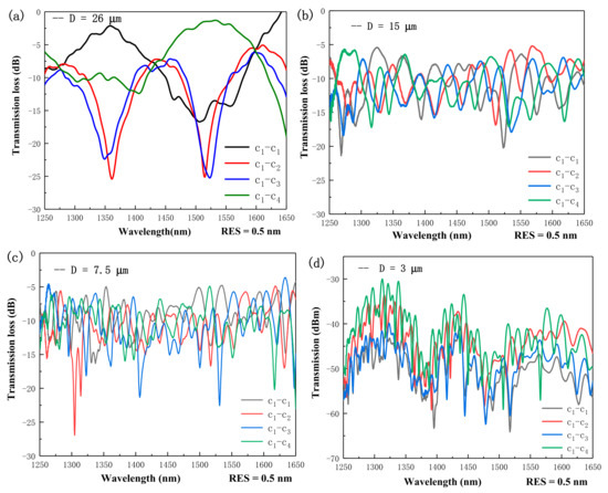 For measurement, the optical resolution (RES) of the OSA was set at 0.5 nm. The spectral responses of the tapered FCF interferometer at different D values are shown in Figure 2a–c. The curves with different colors reflect the input and output power port. For instance, the c1–c1 and c1–c2 means the direct-through and cross-coupled states, respectively. It is interesting to note that at D = 26 μm, the spectral responses of the c1–c2 and c1–c3 were highly similar and in phase, as shown in Figure 2a. However, the c1–c4 was clearly out of phase with respect to the c1–c1 at the wavelengths longer than 1450 nm. This explicitly reveals that the evanescent coupling occurred between c1 and c4 at the wavelengths longer than 1450 nm. With a much further reduced D, the evanescent coupling between the c1 and c4 could overlap more tightly, and the interfering spectral oscillations could thus extend to the wavelengths shorter than 1450 nm. Under such circumstance, the asymmetric supermodes would then be entirely supported by the quadruple core configuration. From Figure 2a, the two neighboring cores had the same distance from the excitation core, and thus their spectral responses would be highly similar. On the contrary, the diagonal core was furthest away in terms of the excitation core. The influence of the diagonal core on supermode generation started from the longer wavelengths, and this is the reason why the spectral curve c1–c4 was out-of-phase to that of the c1–c1 at the longer wavelength end. This phenomenon disappeared when D was smaller than 20 μm. It is because a reduced distance between cores gave rise to higher coupling coefficients and longer interaction lengths to lead to the over-coupling effect between the asymmetric supermodes. Hence, the synchronous in-phase spectral characteristics for c2 and c3 were gradually missing with a reduced D. Another reason is that the c2 and c3 were not stringently identical, so that the coupling coefficients gradually changed with decreasing D as well. From Figure 2b, the average extinction ratios (ER) decreased, whereas the average insertion losses increased for all the curves, compared with that in the Figure 2a. It again can be realized that the four cores were not physically identical in the dimensions and the distance between them. Thus, perfect coupling was becoming more and more difficult to be achieved. However, the main reason was coming from the asymmetric supermodes due to corner-core excitation. On the other hand, with a longer tapered length, the free spectral range (FSR) decreased accordingly, as shown in Figure 2b,c, since a smaller D can give rise to a stronger overlap interaction between four cores for over-coupling situations. Therefore, with the decrease of D of TFCF, the density of the interference fringe increases, and the fringe becomes steeper. Straightforwardly, the OPD will thus be enhanced to improve the strain sensitivity when the TFCF is slightly stretched. From Figure 2c, it is interesting to find that the ER could be significantly improved at some resonant wavelengths. It is believed that the loss of the physical identity between the four cores becomes less effective when D becomes smaller. However, the increased insertion losses are unavoidable due to the excited higher order supermodes at a smaller D. In short, with a reduced D, the FSR and insertion losses are decreased and increased, respectively. The ER may increase contingent upon whether the physical identity between cores is or not maintained. The evolution of the spectral responses in Figure 2a–c reflected the excitation of the supermodes from the tri-core structure at the beginning stage and then transited to the quadruple-core structure as well as the influences of the asymmetry of the supermodes on the spectral characteristics. Obviously, a smaller D can lead to the excitation of higher order supermodes and enhanced OPD for higher sensitivity for strain sensing.