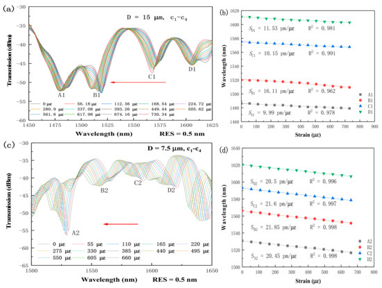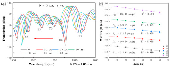 For strain sensitivity measurements, three TFCF samples with D = 15 μm, 7.5 μm, and D = 3 μm were prepared. The corresponding total taper length and uniformed taper length for the three samples were (20, 30, 30.65) mm and (2.8, 2.21, 2.65) mm, respectively. The total taper length was the length containing the uniformed taper length plus the bilateral taper transition length. The bilateral ends of the TFCF were fixed by two mechanical clampers and then stretched by pulling the clampers outward, driven by a stepping motor, with an increment of 5 μm for each step. The spectral responses for D = 15 μm, 7.5 μm, and 3 μm are shown in Figure 3a,c,e in which the resonant dips A, B, C, D blue shifted with increasing tensile stress. The strain can be calculated by the following equation: