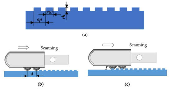 To sum up, research on texture detection needs more extensive and systematic investigations. FFT processing directly on the tactile signals can quickly and easily obtain texture feature information, such as the spatial period and ridge height of the ridge texture. However, due to the limited performance of most simple-structured tactile sensors to discern the tiny structural variation, FFT processing does not perform well in situations of fine texture detection. Thus, a tactile sensor with a higher sensitivity is needed. However, the capability of the existing simple tactile sensor to detect weak force changes is still far behind that of humans [23]. Another common processing method is the machine learning method. The tactile signals are used to train the models to accurately classify different textures, but that needs to go through a complicated learning process, and detailed feature information of the surface textures cannot be detected. Therefore, a universal, real-time method based on a tactile sensor with a simple structure for fine texture detection is extremely needed.