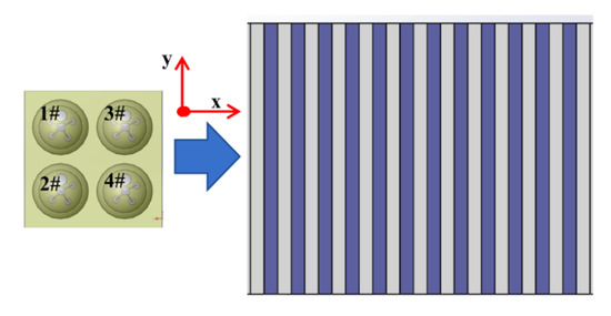 The main experimental process is as follows. As shown in Figure 6, the sensing cells are distributed on the surface of the tactile sensor in a 2 × 2 array, numbered 1#, 2#, 3#, 4#, respectively, and the distance of two adjacent sensing cells along the x-axis and y-axis are equal. When the tactile sensor starts from the initial position and slides across the sample surface along the x-axis direction that is perpendicular to the ridge texture at a certain speed, we can obtain the time interval ∆t of the signals generated by adjacent sensing cells for the same ridge. The positive x-axis is selected previously as the sliding direction of the tactile sensor; thus, the signals generated by the sensing cells 1#, 3# and 2#, 4# form a signal group with time-domain correlation, respectively and the two signal groups are in a control relationship with each other. Selected the signal group (1#, 3#) as the experimental result to validate the method proposed in this article.