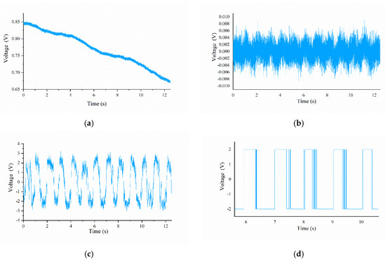 The processing flow of the raw output signal of sensing cell 3# is shown in Figure 7. The sample used is the S31 sample with a ridge height of 0.9 μm, a ridge width of 300 μm, and a spatial period of 2000 μm. Due to the inevitable irregular jitter of the linear stage during the sliding experiment, the signal exhibited a baseline drift phenomenon, as shown in Figure 7a. The signal passed through a high-pass filter with a cut-off frequency of 1 Hz to remove low-frequency interference, and we obtained the original signal with a baseline at 0, as shown in Figure 7b. After inputting the original signal and the Gaussian white noise with a certain noise intensity into the bistable system stochastic resonance model based on the Langevin equation, the first-order ordinary differential Equations (2) and (3) are solved by the fourth-order Runge–Kutta algorithm. The proper noise intensity of Gaussian white noise can make the output signals have a larger signal-to-noise ratio (SNR, hereafter), but because the amplitude difference of the input signals is small and the optimal SNR of output is not the goal, we selected the same noise intensity through prior experiments and generated the noise signal with the Matlab function. The signal processed by SR is shown in Figure 7c, and its signal characteristic has been significantly enhanced. Since the signals have obvious characteristics, the time interval Δt can be easily obtained through correlation analysis with the processing result of the signal generated by sensing cell 1#. The frequency-domain signal obtained by FFT processing contains the principal frequency information fprin and its amplitude information A. The difference between the two states of the time-domain signal is obvious, but there is still a certain amount of noise that interferes with the acquisition of texture information. Passed the randomly intercepted signal segment through a software-designed threshold comparator with a threshold of 1 V to obtain a state-unified signal, as shown in Figure 7d. The ratio of the high-level state of the signal segment to the level period is calculated and mapped to the ratio n of the ridge width to the spatial period in the ridge texture. The texture feature information of the corresponding sample can be figured out by combining the parameter results obtained above.