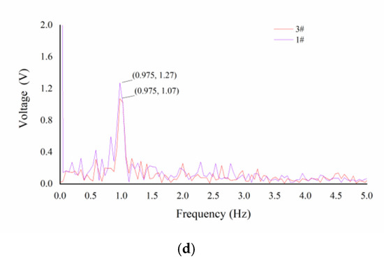 Signals processed by SR exhibit a stronger signal characteristic in both time and frequency domains. Figure 8 shows the output voltages (i.e., 1# and 3#) of two piezoresistive die located at two adjacent tactile sensing cells. These signals have been previously processed in advance with a high-pass filter to remove low-frequency interference. As shown in Figure 8a, it is observed that the output original signal has strong random noise, especially, there is only slight periodic vibration when the tactile fingertip slides over the fine texture sample. Meanwhile, the time interval, as described in Section 3.1, is difficult to be measured from the two original outputs. By comparing Figure 8a,b, we can find that after the original signal is processed by the bistable system stochastic resonance model, the signal characteristic of the signal is significantly enhanced. The two states of the SR-processed signal have an obvious difference and have a large noise tolerance. Moreover, the dynamic part is mainly composed of periodic signals, which correspond to the stage of the sensor sliding over the surface ridge texture. Others parts are the static parts that are caused by the bistable system stochastic resonance model driven by random noise. The signal state carried out transition switching according to the Kramers transition rate rk, which depends on the noise distribution and intensity. Therefore, we can easily obtain the time interval through correlation analysis. Comparing Figure 8c,d, it can be found that the stochastic resonance method does not affect the principal frequency of the original periodic signal and makes its amplitude more prominent than other frequencies, which is recognized as noise. The difference between the amplitude of the principal frequency corresponding to the two sensing cells is caused by the difference in the structure during manufacturing.