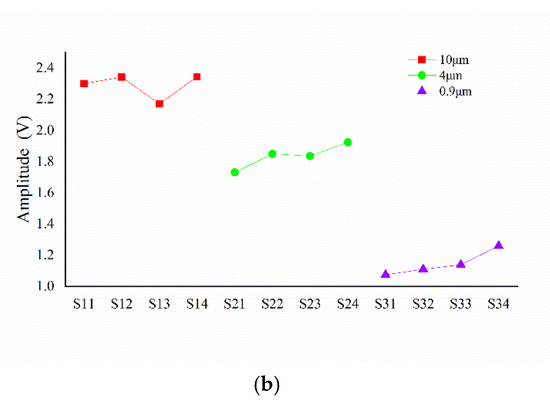Some existing researches use multi-array tactile sensors and fast Fourier transform (FFT, hereafter) technology to obtain characteristic signals and estimate the surface texture information of objects, which had certain limitations. In 2011, C.M. Oddo et al. [10,11] developed a 2 × 2 MEMS piezoresistive tactile sensor array with high spatial resolution and sensitivity and integrated it on the fingertips of humanoid robot fingers with bionic fingerprints. When actively touching, it could quantitatively evaluate the ridge texture with a spatial period difference as low as 40 μm (400, 440, 480 μm spatial periods, 1 mm ridge height). H.B. Muhammad et al. [12] proposed a capacitive tactile sensor array based on silicon MEMS, which resolved forces in the sub-mN range and successfully distinguished fine ridge textures with ridge heights of 200 μm and spatial periods as low as 200 μm. However, the research mentioned above on object surface information detection mainly focused on the estimation of the spatial period of ridge textures in the micron range and did not reach the capability to detect fine textures with ridge heights of several microns, such as human fingers [13,14]. In order to eliminate the influence of the difference between the mechanical properties of structural materials such as friction and frequency characteristics and human fingers on the sliding tactile signal, in 2019, Yasutoshi Takekawa et al. [15,16,17] developed a wearable skin vibration sensor to detect the skin-propagated vibration caused by finger rubbing an object surface, and successfully identified the spatial period and ridge height information of the fine ridge texture by calculating the power spectral density of the sensor output signal. The minimum ridge height of the fine texture exceeded the limitation to 25 μm, but in this situation, the characteristic of the signal was already very weak, and the detectable performance of the signal was limited.