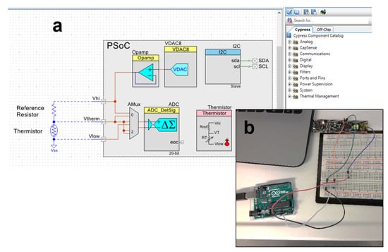 Figure 3. (a) Example of a PSoC® Creator™ IDE design for a thermistor application. (b) Testing the I2C connection between Arduino UNO (master) and the PSoC® platform (slave). - -