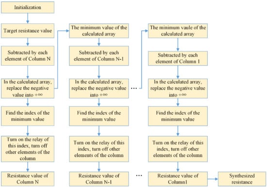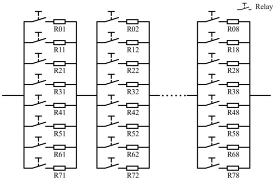 For instance, considering that the resistors are divided into eight columns, each column comprises eight parallel resistors, and a relay accompanies each resistor, the schematic diagram of the resistance synthesis is presented in Figure 2.