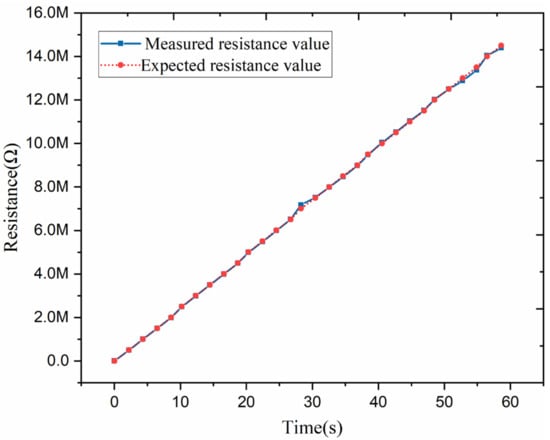 It is essential to verify the synthesized resistance values’ correctness before performing the power evaluation step. In the test case, the initial resistance value, final resistance value, and resistance value change are set to 0 M Ω , 14 M Ω , and 0.5 M Ω per two seconds, respectively. The PXI-4070 multimeter is used to measure the synthesized resistance. The measured data are presented in Figure 5. The test data indicate that the resistance can be programmably synthesized in the desired manner and used for TENG power evaluation.