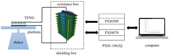 A TENG device is placed on a vibration shaker, generating a contact-separation movement under harmonic vibration excitation. The APEW is connected to the TENG in series. A metallic box shields the resistance circuit boards to prevent electromagnetic interference. The PXI-6509 module is used to control the relays according to the proposed algorithm. In addition, the PXI-4070 module is used to acquire the voltage waveform across the synthesized resistor. The schematic diagram of the experimental power evaluation system is illustrated in Figure 6.