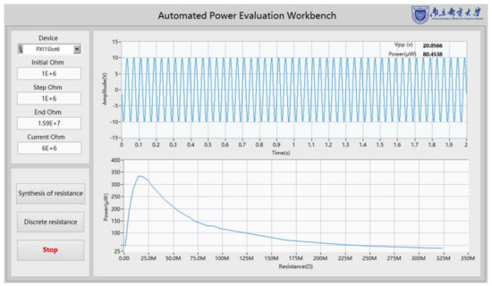 The “Initial Ohm” sets the minimum load resistance value during the test, while the synthesized resistance increases according to the “ Step Ohm” value. When the “Synthesis of resistance” is pressed, the APEW starts to work. Considering the resistor’s accuracy and accelerating measurement speed, when the synthesized resistance value is greater than 15 M Ω , 16 fixed large-value resistors are used as external load. Consequently, a quicker test process is performed when the “Discrete resistance” button is pressed, covering the fixed large load resistance values. The collected voltage waveform is displayed in a real-time waveform diagram. When the test is completed, the output power curve of TENG is automatically generated in the waveform chart.