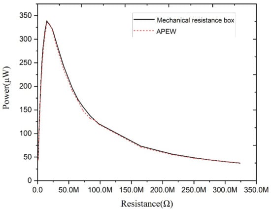 It can be seen from the measured data of the APEW system that the TENG’s maximum output power is 335.82 μ W and the optimal load resistance is 14.587 M Ω . On the contrary, the manual tuning’s maximum output power and optimal matching load are 338.89 μ W and 14.587 M Ω , respectively. Therefore, the power deviation is 0.91%, which is due to the accuracy of the electronic components and variation om the parasitic parameters. Consequently, the experimental data justify the feasibility of using APEW to obtain the TENG’s output power curve.