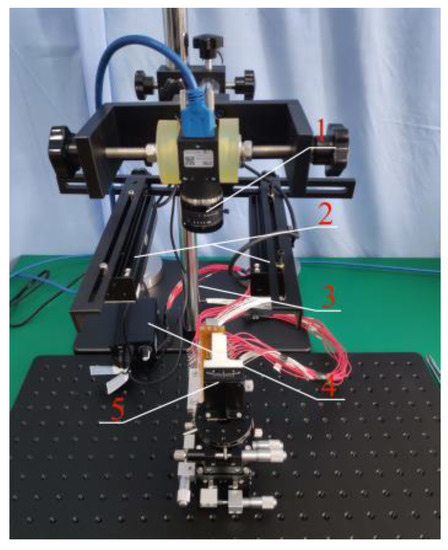 The brush wire angle measuring device is shown in Figure 2. The device consists of a camera (1), two light sources (2), a support frame (3), a light source controller (4), and an angle forming device (5). In this paper, we chose the model MER-500-14U3M CMOS black-and-white surface array camera of the Daheng Mercury (Beijing, China) series with a resolution of 2592 × 1944 and a mechanical size of 29 mm × 29 mm × 29 mm, which is compact in size and convenient to install. The pixel size is 2.2 μm × 2.2 μm. The selected focal length of the lens should have been 8 mm, and positive illumination was selected. In order to avoid the generation of positive lighting shadows, we selected symmetrical lighting to offset the generation of shadows. The LED light source was selected, and the light source consisted of a controller and two strip light sources.
