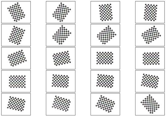 As shown in Figure 3 and Figure 4, a 12 × 9 float glass tessellation calibration template with a processing accuracy of 0.01 mm and a cell side length of 10 mm was selected. Twenty tessellated grid images were acquired according to different tilt angles. By detecting the coordinate values of sub-pixel corner points, the internal reference matrix and aberration coefficient of the camera were calculated. The original image matrix was transformed to eliminate the effects of radial and tangential aberrations. The final correction processing of the images was realized.