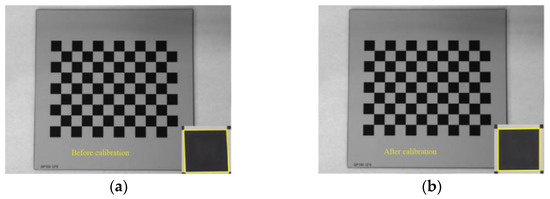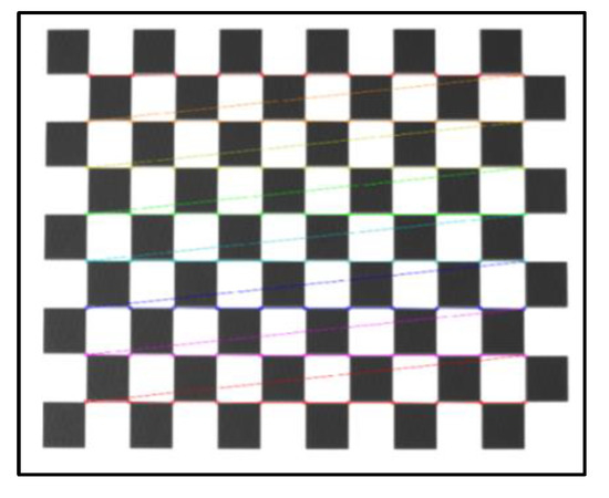 The average reprojection error is generally considered to be less than 0.5 pixels, which indicates a high calibration accuracy. The average reprojection error of this calibration was 0.0128 pixels, which meets the requirements of camera calibration. As shown in Figure 5, the calibration plate images before and after calibration were compared. It can be seen that the corrected images obviously reduce the influence of distortion.