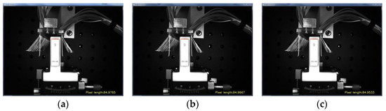 In this paper, a standard block measuring 9 mm × 9 mm × 30 mm was used, and the number of edge pixels of the block at the current shooting distance was obtained by image processing. The calibration value of the pixel equivalent was obtained by calculating the ratio of the real size of the standard block to the acquired pixel size. As shown in Figure 7, the figure takes the results of one, four, and eight measurements during the measurement process. The average pixel length of the block in the current state can be calculated as 84.9634 pixels from the 8 measured experimental data points, which further results in the pixel equivalent value K = 9/84.9634 = 0.1059.