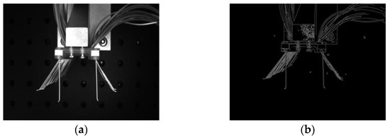 In order to ensure accuracy in image recognition and measurement, the detection of feature edges is required for preprocessed images. In the detection process, a pixel point with a gray value greater than a threshold is an edge, and a pixel point with a value less than that threshold is not an edge [27,28]. The more commonly used edge detection algorithms are the Sobel, Laplace, and Canny algorithms. Sobel edge detection is more effective in cases where there is more noise in the image. Laplace edge detection can be used to determine the bright and dark areas of the image. Canny edge detection can effectively resist the interference of noise and detect the true image. Therefore, the Canny edge detection algorithm was chosen to detect the edges of the image in this paper. From Figure 11, it can be seen that after Canny edge detection, the edges of the brush wire and the positioning block of the brush plate were well reflected.