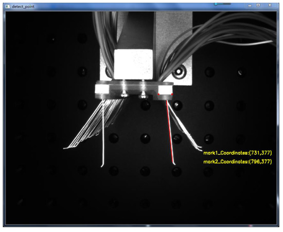 Compared with straight line detection in images, corner point detection has less influence under different lighting conditions and has the advantage of being almost invariant when the image is rotated at different angles. The corner points retain important local detail information during image acquisition, and the corner-point-based detection information has a certain degree of accuracy. As shown in Figure 12, the position of the corner point of the positioning block on one side of the brushboard was detected, and the detection results yielded the pixel coordinates of (pixel 731, pixel 377) for the left corner point and (pixel 796, pixel 377) for the right corner point. The edge straight line detection was also performed by constructing a mask for the brush wires to be detected. Based on the Hoff straight line detection algorithm, the left edge of the brush filament was a detected straight line, and the detection results are shown in Figure 12.