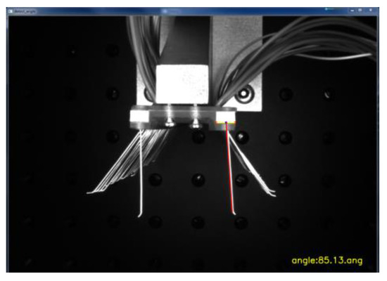 As shown in Figure 13, by obtaining the values of the four coordinate points in the image, the slope of the line at the detection edge of the brush wire and the slope of the line where the two corner points of the positioning block were located were calculated, respectively. The line where these two corner points were located was used as the reference line. The angle value between the two lines was further calculated by the tangent formula, and the resulting angle value was the actual angle at which the brush wire was tilted. As shown in Figure 14, the angle value of the brush wire was tested, and the angle of the brush wire was 85.13° at this time.