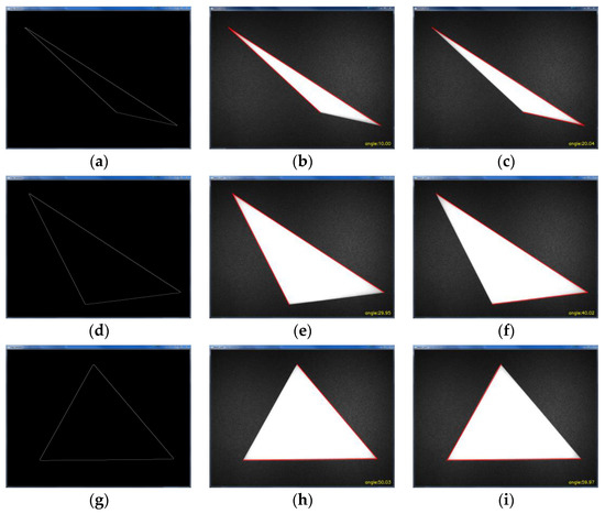 As shown in Figure 15, the outline of the triangle was first obtained using Canny edge detection. Then, the angle values were detected for three different angles of the triangle, respectively. The measurement results are shown in Table 2. The pixel coordinate values of each triangle vertex were obtained separately to determine the angle positions, and the angle detection was performed for 10°, 20°, 30°, 40°, 50°, and 60°, respectively. The data in Table 2 show that the measurement error is within 0.05°, which meets the requirements of this paper for brush wire angle detection.