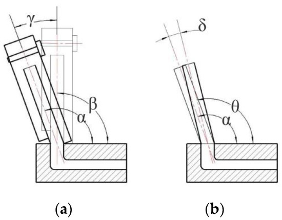The deformation of the brush wire during the bending process can be divided into two parts, namely, the elastic deformation stage and the plastic deformation stage. As shown in Figure 16a, the initial angle of the brush wire before forming is β, and the bending deformation is produced by the action of the deflector plate and the clamping plate. The forming angle is α and the deflection angle of the deflector plate and the clamping plate is γ. This is the angle forming stage of the brush wire. When the angle forming stage was completed, the deflection plate and the clamping plate were unloaded, and the plastic deformation of the brush wire disappeared gradually due to the high elasticity of the brush wire itself. As the elasticity was restored, the material on the pulled side of the brush wire shrank and the material on the other side elongated, resulting in the forming angle of the brush wire being smaller than the theoretical forming angle, which is called the springback phenomenon of the brush wire. As shown in Figure 16b, when the deflection plate and clamping plate were unloaded, the brush wire produced a certain amount of springback. θ is the forming angle after the brush rebound, and the springback angle is δ, which seriously affects the accuracy of brush wire forming.
