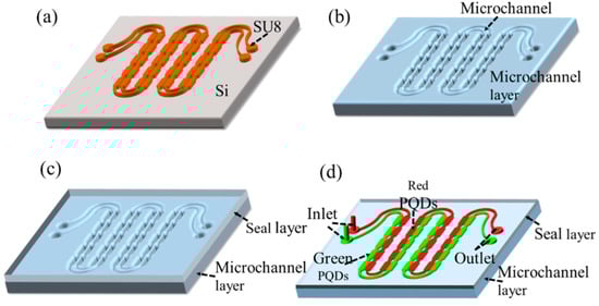 The fabrication of FQCL includes making SU8 molds, making a flexible microchannel layer and seal layer, flexible chip bonding, and injecting the quantum-dot solution. Both the microchannel layer and the seal layer of the chip are made of polydimethylsiloxane (PDMS) materials with good bending properties. A schematic diagram of the bending of the FQCL chip is shown in Figure 1b.